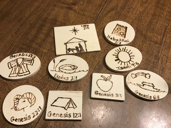 I have always loved the idea of a Jesse Tree. A Jesse Tree is basically a group of symbols celebrating and remembering all of the most important people (mainly in Jesus’ family tree) and the many bible events that lead up to Jesus’ birth. There are many different versions, so I kind of selected the ones that were meaningful to me. I decided to buy a wood ornament set (on sale for $4!) and burn my own images into each one because there was no way I wanted to pay $70+ on one from Etsy. I had fun picking out which symbol to include on each one as well as picking out which verses we will be reading.