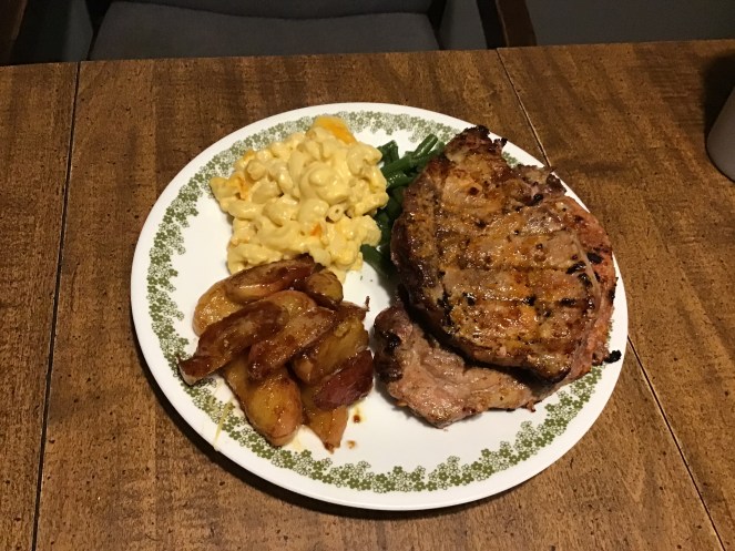 This week, Ben helped me make dinner one night. I grilled the meat because he is not a fan of raw meat, but everything else he made. We had grilled pork chops, fried apples, macaroni and cheese, and steamed green beans. He was so happy that people were eating his food and that it turned out well!